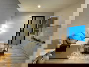 The condo is fully furnished, featuring a sleek living room with mirrored cabinets, a flat-screen TV, and a sophisticated entertainment unit. Enjoy the comfort of wooden flooring and air conditioning. The minimalist design extends into the bedroom, offering a spacious double bed, floor-to-ceiling curtains, and recessed lighting to complement the neutral wall tones.