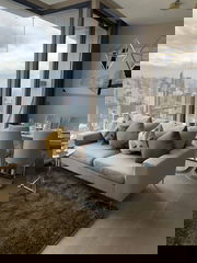 - Living Room: An open floor plan accentuated by large windows that frame panoramic city skyline views, hardwood flooring, modern lighting, and decorative plants.