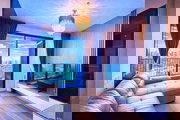 The condos open concept living room boasts a spacious layout, perfect for relaxation and entertaining. The oversized windows deliver panoramic views of Bangkoks skyline while filling the space with refreshing daylight.