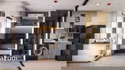 - Kitchen: A compact yet fully-equipped space with modern appliances, wooden cabinetry, and an integrated washing machine.
