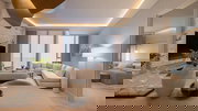 ห้องนอนหลักมีขนาดกว้างพร้อมหน้าต่างสูงจรดฝ้าเพดานและผ้าม่านกรองแสงและม่านทึบ ห้องนี้เชื่อมต่อกับพื้นที่ตู้เสื้อผ้าแบบวอล์กอินบิวท์อินเต็มผนังพร้อมแสงไฟซ่อน เสริมบรรยากาศทันสมัยและเป็นระเบียบ ห้องน้ำออกแบบสไตล์โมเดิร์นมีอ่างอาบน้ำบิวท์อิน ผนังลายหินและเคาน์เตอร์อ่างล้างหน้าคู่พร้อมตู้กระจกบานใหญ่และแสงไฟซ่อนช่วยให้ใช้งานสะดวกสบาย ผู้ซื้อสามารถตกแต่งเฟอร์นิเจอร์เองได้เต็มที่เนื่องจากห้องยังไม่มีการจัดวางเฟอร์นิเจอร์ถาวร